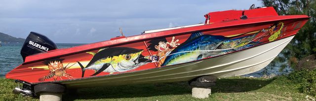 Sans Spica pour découvrir le lagon, nous partons pour une excursion en barque pleine balle, sans taud, sans coussin, à la dure! Presque une visite privée que l’on partage avec un touriste hollandais de la pension. C’est le fils de notre hôte, Apeiti, qui nous sert de guide accompagné d’un marin-cuisinier. Au menu : les trois îles hautes principales après Mangareva : Aukura, Akamanu et Taravai. Le lagon est splendide avec des couleurs turquoises d’où émergent ces îles volcaniques couvertes de végétation. Les baies sont encombrées de fermes perlières avec leurs petites cabanes sur pilotis et les bouées des parcs à huitre à perte de vue.