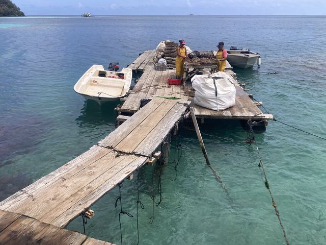 C’est la saison de collecte du naissain. Ici c’est la récolte de la première greffe. Le travail à la chaine est très bien organisé : les plongeurs ramènent les pochons d’huitres ; sur le ponton, deux détroqueuses nettoient les huitres.