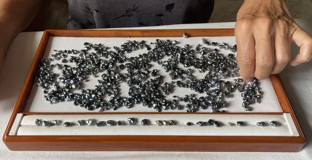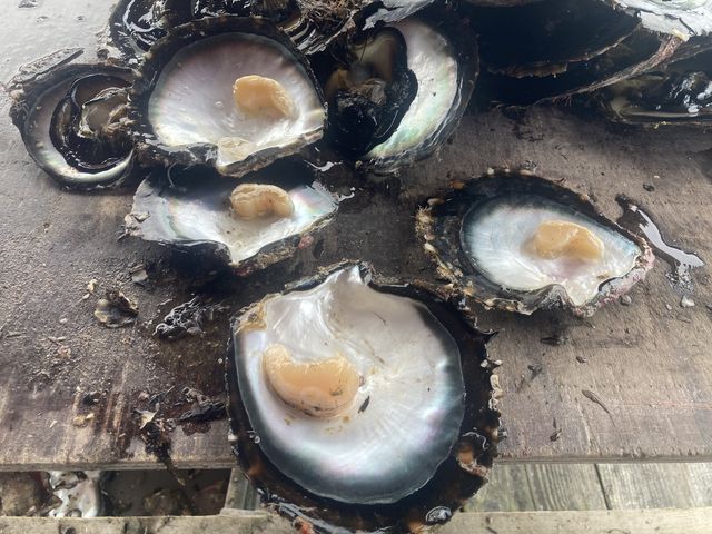 De retour à la pension, Michel T. nous montre des perles de sa production et des keishis, amas de nacre dans les huitres qui ont rejeté leur nucleus, presqu’aussi recherchés que les perles. Les keshis sont vendus au poids, mais la balance de Michel est en panne, dommage!