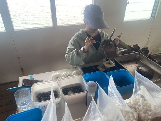 Ce sont des huitres de 4 ans, déjà greffées une première fois. Elle incise la poche génitale pour retirer la perle et, selon l’état de l’huitre, la qualité de la perle extraite et d’autres paramètres…, elle décide de greffer une deuxième fois (soit environ dans 30% des cas) en introduisant un nucléus d’une taille appropriée. Ses gestes sont d’une extrême précision, avec un savoir-faire acquis pendant plusieurs années.