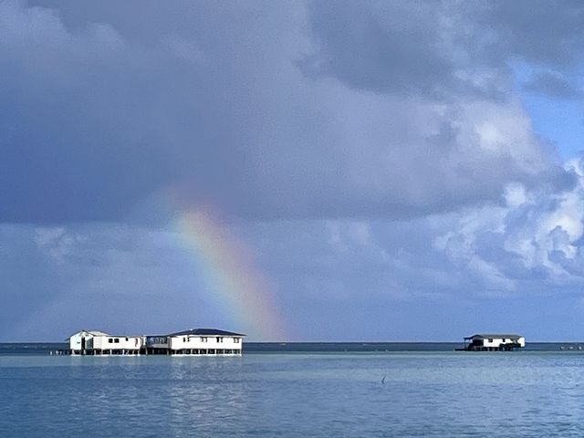 Le site et magnifique, d’un calme absolu. Le bungalow donne sur une plage de sable fin. On prend les repas dans un fare construit sur un deck au dessus de l’eau. Au bout d’un long ponton sont amarrées les barques de travail. De nombreuses fermes perlières occupent les bords du lagon mais, en ce début décembre, il n’y a pas beaucoup d’activité. Michel nous accueille très chaleureusement et nous fait partager son amour des Gambier, en abordant aussi son histoire et les problèmes actuels. Golden, le chien de la pension, devient notre compagnon de promenade et notre ange gardien.